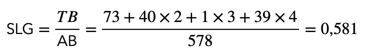 Como ejemplo, dejo el cálculo del SLG para uno de mis jugadores favoritos, Mookie Betts (LAD). Ahora mismo sus estadísticas son: 177 hits, 73 singles,  40 dobles, 1 triples y 39 HR. Además, tiene unos 578 turnos de bateo. Por lo tanto su porcentaje de slugging sería: