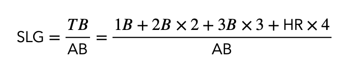 El porcentaje de slugging difiere del promedio de bateo en que no todos los hits tienen el mismo valor. Mientras que el promedio de bateo se calcula dividiendo el número total de hits entre el número total de turnos al bate, la fórmula para el porcentaje de slugging le valores diferentes a los singles, dobles, triples y home runs.
